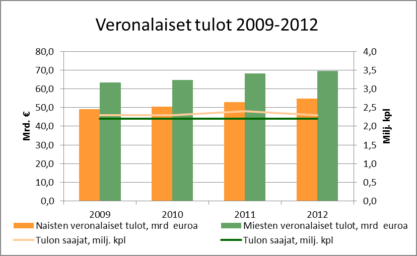 Veronalaisia tuloja oli henkilöasiakkailla vuonna 2012 yhteensä 124,45 miljardia euroa. Niistä naisten osuus oli 54,8 miljardia euroa eli 44,1 prosenttia ja miesten 69,6 miljardia euroa eli 55,9 prosenttia. Veronalaisia tuloja sai 2,328 miljoonaa naista ja 2,231 miljoonaa miestä.
