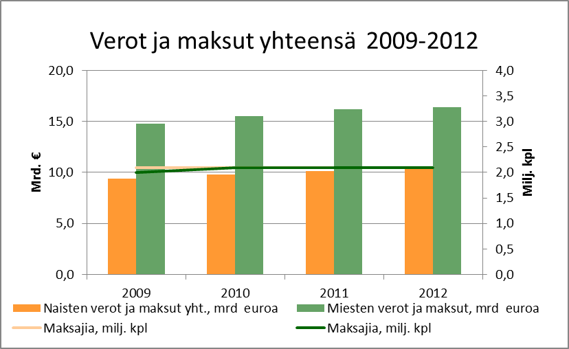 Verojen ja maksujen määrä vuonna 2012 oli henkilöasiakkailla yhteensä 26,80 miljardia euroa. Miehet maksoivat siitä 61,2 prosenttia ja naiset 38,8 prosenttia. Maksajista naisia oli 2,133 miljoonaa ja miehiä 2, 085 miljoonaa. Naiset maksoivat veroja ja maksuja keskimäärin 4 877 euroa/henkilö ja miehet 7 864/henkilö.