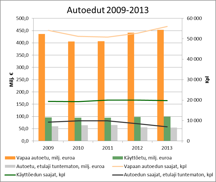 Verovuonna 2013 työnantajien luontoisetuna antaman vapaan autoedun arvo oli 453 miljoonaa euroa (+ 5,2 %) ja käyttöedun arvo 99,5 miljoonaa euroa (+ 3,6 %). Vapaata autoetua sai 53 091 henkilöä (+3,8 %) ja käyttöetua 19 702 henkilöä (-0,1 %).