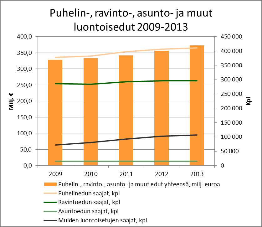 Puhelinedun sai yhteensä 410 241 henkilöä (+ 2,3 %), ravintoedun 295 900 henkilöä (+ 1,4 %), asuntoedun 15 623 henkilöä (+ 1,4 %) ja muun luontoisedun 107 355 henkilöä (+ 11,2 %).