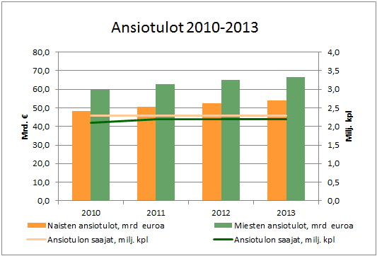 Ansiotulojen määrä henkilöasiakkailla oli vuonna 2013 yhteensä 120,4 miljardia euroa. Siitä naisten osuus oli 54,1 miljardia (44,9%) ja miesten 66,3 miljardia euroa (55,1%). Ansiotulojen määrän kasvu vuodesta 2012 oli naisilla 2,9 prosenttia ja miehillä 2,0 prosenttia.