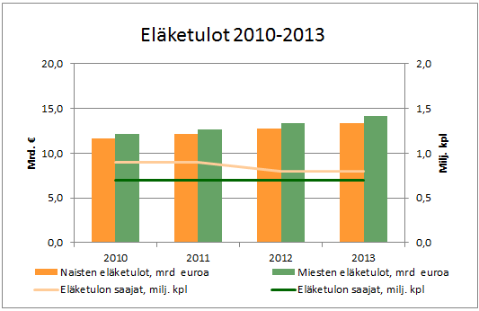 Eläketulojen yhteismäärä henkilöasiakkailla vuonna 2013 oli 27,6 miljardia euroa. Naiset saivat tästä 13,4 miljardia euroa (48,6 prosenttia) ja miehet 14,2 miljardia (51,4 prosenttia). Eläketulojen saajista miehiä oli 0,69 miljoonaa ja naisia 0,85 miljoonaa. Keskimäärin tarkasteluna naisten eläketulot olivat 15 823 euroa/henkilö ja miesten eläketulot 20 473 euroa/henkilö.