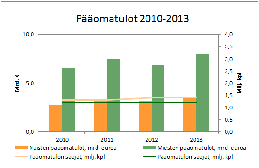 Henkilöasiakkaat saivat pääomatuloja vuonna 2013 kaiken kaikkiaan 11,4 miljardia euroa. Naisten osuus oli 3,4 miljardia euroa (29,8 prosenttia) ja miesten 8,0 miljardia (70,2 prosenttia). Naisten pääomatulot kasvoivat 9,7 prosenttia ja miesten 17,6 prosenttia vuodesta 2012.