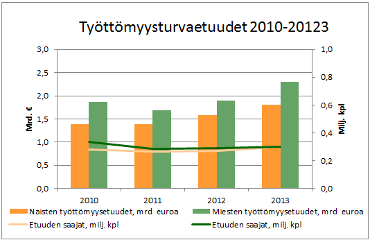 Työttömyysturvaetuuksia maksettiin vuonna 2013 yhteensä 4,1 miljardia euroa. Naisten osuus oli 1,8 miljardia (43,9 prosenttia) ja miesten 2,3 miljardia euroa (56,1 prosenttia). Naiset saivat työttömyysturvaetuuksia 6272 euroa/henkilö ja miehet saivat työttömyysturvaetuuksia 7 003 euroa/henkilö.