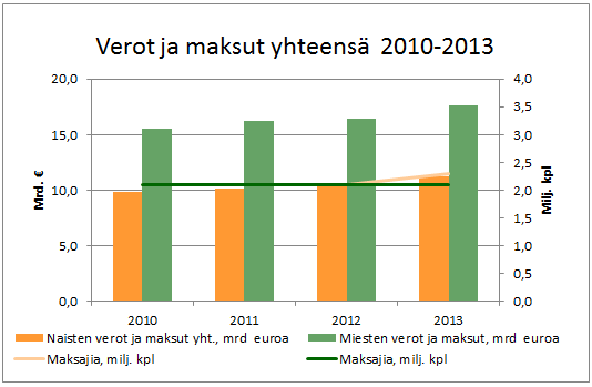 Verojen ja maksujen yhteismäärä vuonna 2013 oli henkilöasiakkailla yhteensä 28,7 miljardia euroa. Miehet maksoivat 17,5 miljardia (61,0 prosenttia) ja naiset 11,2 miljardia euroa (39,0 prosenttia). Maksajista naisia oli 2,26 miljoonaa ja miehiä 2,16 miljoonaa. Naiset maksoivat veroja ja maksuja keskimäärin 4 954 euroa/henkilö ja miehet 8 122 euroa/henkilö.