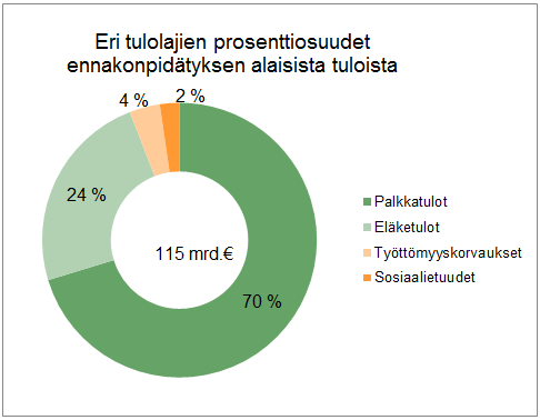 Ansiotulojen ja muiden etuuksien osuudet kaikista ennakonpidätyksen alaisista tuloista jakaantuivat siten, että palkkatulot olivat 70 prosenttia, eläketulot 24 prosenttia, työttömyyskorvaukset 4 prosenttia ja sosiaalietuudet 2 prosenttia.