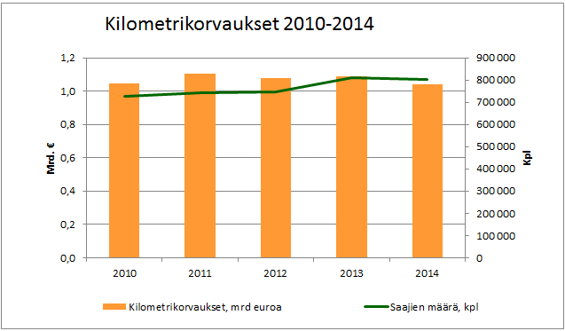 Verovuonna 2014 työnantajat maksoivat verovapaita kilometrikorvauksia yhteensä 1,0 miljardia euroa (- 4,6 %). Kilometrikorvauksia sai yhteensä 802 196 henkilöä (- 0,8 %).