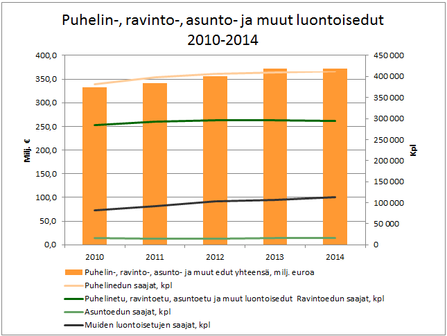 Puhelinedun sai yhteensä 412 551 henkilöä (+0,6 %), ravintoedun 294 846 henkilöä (-0,4 %), asuntoedun 15 265 henkilöä (-2,3 %) ja muun luontoisedun 112 659 henkilöä (-4,9 %).