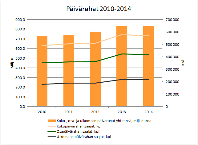 Verovuonna 2014 työnantajat maksoivat verovapaita päivärahoja yhteensä 834,0 miljoonaa euroa (+0,3 %). Kokopäivärahoja sai yhteensä 568 131 henkilöä (-1,8 %), osapäivärahoja 417 649 henkilöä (-1,4 %) ja ulkomaan päivärahoja 215 675 henkilöä (-0,9 %).