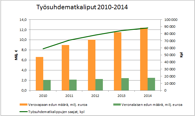 Verovuonna 2014 työnantajien luontoisetuna antaman työsuhdematkalippuedun arvo oli yhteensä 2,5 miljoonaa euroa (+4,2 %). Työsuhdematkalipun sai 88 306 henkilöä (+4,6 %).