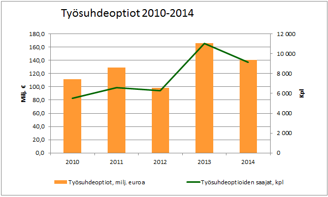 Verovuonna 2014 työnantajien luontoisetuna antamien työsuhdeoptioiden arvo oli yhteensä 140,5 miljoonaa euroa (-15,3 %). Työsuhdeoptioita sai 9 156 henkilöä (-17,0 %).