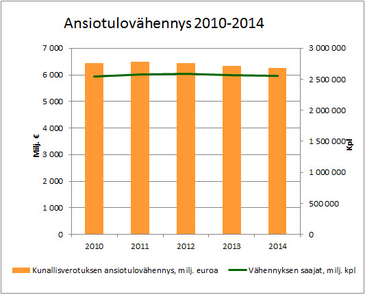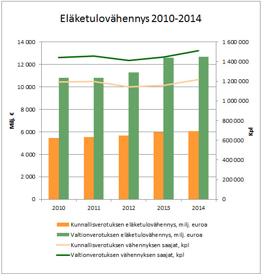 Vähennyksiä ansiotuloista tehtiin verovuonna 2014 valtionverotuksessa 22,7 mrd. euroa ja kunnallisverotuksessa 25,6 mrd. euroa. Suurimmat euromääräiset vähennyserät olivat valtionverotuksen eläketulovähennys yhteensä 12,7 mrd. euroa , kunnallisverotuksen ansiotulovähennys yhteensä 6,3 mrd. euroa ja kunnallisverotuksen eläketulovähennys yhteensä 6,1 mrd. euroa.