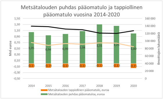 Verovuonna 2020 metsätalouden puhdasta pääomatuloa ilmoitti 84 800 metsänomistajaa (-10,2 %) yhteensä noin miljardi euroa, mikä on 249 miljoonaa (-19,9 %) vähemmän kuin vuonna 2019. Keskimääräinen metsätalouden puhdas pääomatulo pieneni vuodesta 2019 reilulla 1 400 eurolla ja oli reilut 11 800 euroa vuonna 2020 (mediaani 5 288 euroa). Metsätalouden puhdas pääomatulo lasketaan verovuoden veronalaisten metsätulojen ja vähennyskelpoisten menojen välisenä erotuksena. Tappiollista pääomatuloa syntyy, jos erotus on negatiivinen eli vuosimenot ylittävät metsistä saatavat veronalaiset tulot.