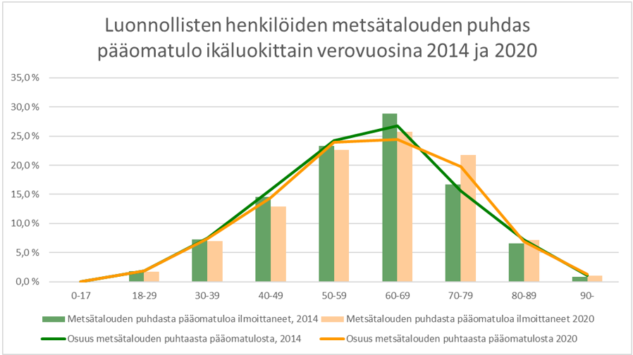 Kun tarkastellaan luonnollisten henkilöiden saaman metsätalouden puhtaan pääomatulon jakautumista ikäluokittain, on nähtävissä, että verrattuna vuoteen 2014, jakauma painottuu vuonna 2020 yhä enemmän vanhempiin ikäluokkiin. Vuonna 2020 suurimman osan (24,4 %) metsätalouden pääomatulosta saivat 60–69 vuotiaat, joita metsätalouden pääomatuloa ilmoittaneiden kokonaismäärästä oli 25,8 %. 60–69-vuotiaiden osuus on kuitenkin pienentynyt vuoteen 2014 verrattuna 3,1 prosenttiyksiköllä. Myös 18–59-vuotiaiden osuus on tällä aikavälillä pienentynyt ja heidän osuutensa oli 44,2 prosenttia vuonna 2020.