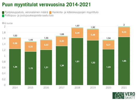 Puukaupassa verovuosi 2021 oli hiljaisemman vuoden 2020 jälkeen taas selvästi vilkkaampi ja puun myyntituloja kertyi henkilöasiakkaille yhteensä lähes 2 miljardia euroa. Vuoteen 2020 verrattuna puun myyntitulot kasvoivat 453 miljoonalla (+29,3 %) ja olivat vuonna 2021 yhteensä 1,997 miljardia euroa. Kasvu johtui etenkin pystykauppatulon veronalaisen määrän kasvusta 34,6 prosentilla 1,22 miljardista 1,65 miljardiin euroon. Myös hankintakauppojen myyntitulo kasvoi 8,8 prosentilla 333 miljoonaan ja polttopuu- ja joulukuusikaupoista saatu tulo 13,2 prosentilla 14,7 miljoonaan euroon.