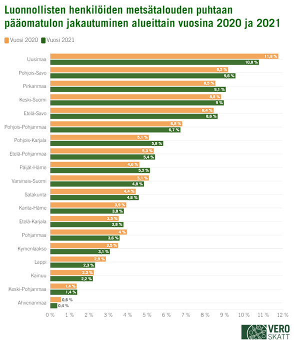 Kuten vuonna 2020, myös vuonna 2021 luonnollisten henkilöiden metsätalouden puhtaasta pääomatulosta suurimman osan (10,8 %) saivat henkilöt, joiden kotikunta sijaitsi Uudellamaalla. Uusimaalaisten osuus laski 1 prosenttiyksiköllä vuodesta 2020. Pohjois-Karjalssa asuvien osuus puolestaan kasvoi 0,7 prosenttiyksiköllä 5,8 prosenttiin.