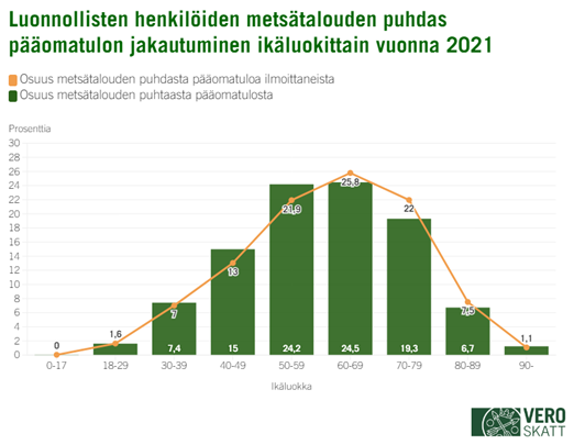 Vuonna 2021 suurimman osan (24,5 %) metsätalouden pääomatulosta saivat 60-69 vuotiaat, joita metsätalouden pääomatuloa ilmoittaneiden kokonaismäärästä oli 25,8 %. Lähes yhtä suuren osuuden pääomatulosta (24,2 %) saivat 50-59-vuotiaat, joita ilmoittajista oli 21,9 prosenttia.