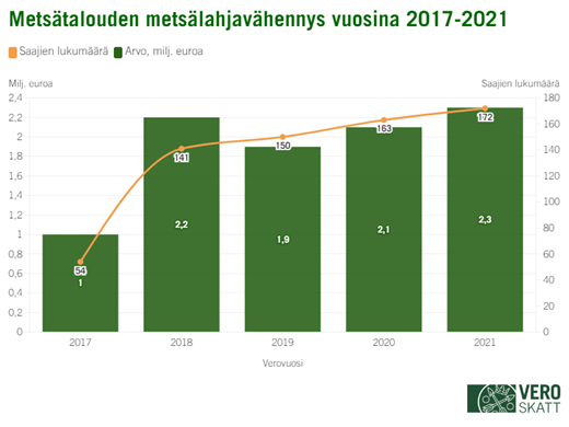 Lahjaksi saadusta metsästä tietyillä ehdoilla tehtävää metsälahjavähennystä sai vuonna 2021 172 asiakasta (+5,5 %), yhteensä 2,3 miljoonaa euroa. Tämä oli noin 195 000 euroa (+9,1 %) enemmän kuin vuotta aiemmin. Keskimääräinen metsälahjavähennys oli suuruudeltaan noin 13 600 euroa (mediaani hieman alle 9 000 euroa). Myös metsälahjavähennystä on voinut saada verovuodesta 2017 alkaen.