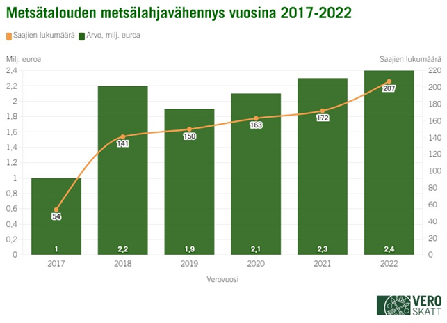 Lahjaksi saadusta metsästä tietyillä ehdoilla tehtävää metsälahjavähennystä sai vuonna 2022 207 asiakasta (+20,3 %), yhteensä 2,4 miljoonaa euroa. Tämä oli noin 100 000 euroa (+4,5 %) enemmän kuin vuotta aiemmin. Keskimääräinen metsälahjavähennys laski vuoden 2021 13 600 eurosta 11 815 euroon (mediaani noin 8 158 euroa). Myös metsälahjavähennystä on voinut saada verovuodesta 2017 alkaen.