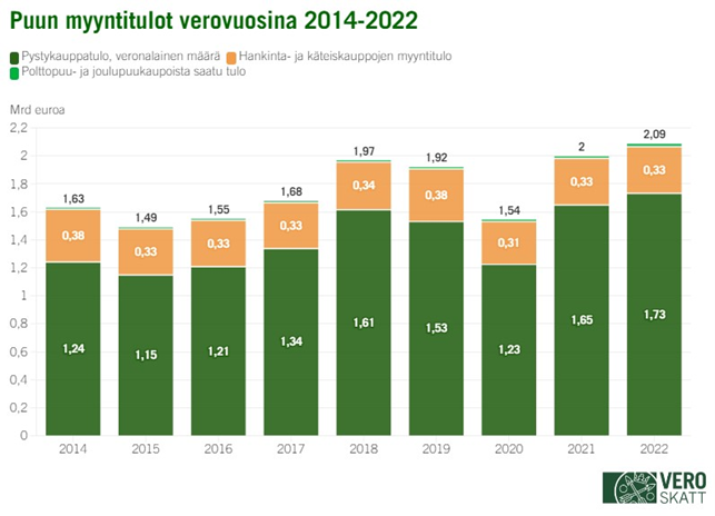 Puukauppa jatkui verovuonna 2022 vilkkaana ja puun myyntituloja kertyi henkilöasiakkaille ensimmäistä kertaa yli 2 miljardia euroa. Euromääräisesti puun myyntitulot ylsivät uuteen ennätykseensä, mutta korkean inflaation vuoksi ne jäivät reaaliarvoltaan alemmalle tasolle kuin esimerkiksi vuonna 2021. Vuoteen 2021 verrattuna puun myyntitulot kasvoivat euromääräisesti noin 89 miljoonalla (+4,4 %) 2,09 miljardiin euroon. Kasvu johtui etenkin pystykauppatulon veronalaisen määrän kasvusta 5,0 prosentilla 1,65 miljardista 1,73 miljardiin euroon. Myös polttopuu- ja joulukuusikaupoista saatu tulo kasvoi 34,7 prosentilla 14,7 miljoonasta 19,8 miljoonaan euroon. Hankintakauppojen myyntitulo kasvoi maltillisesti 0,3 prosentilla 333,9 miljoonaan euroon.