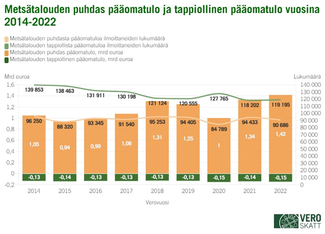 Vuodelta 2022 metsätalouden tietoja ilmoitti yhteensä noin 227 000 henkilöasiakasta, joista luonnollisia henkilöitä oli noin 173 500, verotusyhtymiä 36 700 ja kuolinpesiä 16 900 kappaletta. Metsätalouden puhdasta pääomatuloa ilmoittaneiden osuus laski hieman vuonna 2022 ja oli 39,9 prosenttia (vuonna 2021 vastaava osuus 40,5 %) ja metsätalouden tappiollista pääomatuloa ilmoittaneiden osuus puolestaan kasvoi 52,5 prosenttiin (vuonna 2021 50,7 %). Loput ilmoittajista (7,6 %) tekivät verovuodelta nollatuloksen.
