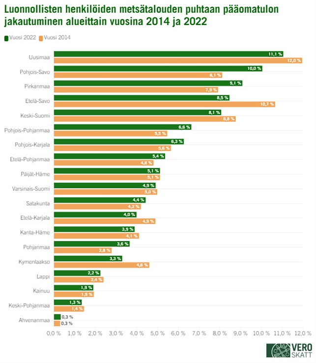 Luonnollisten henkilöiden metsätalouden puhtaasta pääomatulosta suurimman osan (11,1 %) saivat vuonna 2022 henkilöt, joiden kotikunta sijaitsi Uudellamaalla. Uusimaalaisten osuus metsätalouden puhtaasta pääomatulosta on pienentynyt 0,9 prosenttiyksikköä vuodesta 2014. Eniten osuus metsätalouden puhtaasta pääomatulosta on vastaavalla ajanjaksolla pienentynyt etelä-savolaisilla, 10,7 prosentista 8,5 prosenttiin. Osuus on kasvanut eniten puolestaan pohjois-savolaisilla; 8,1 prosentista 10 prosenttiin. Pohjois-savolaiset saivat vuonna 2022 toiseksi suurimman osan metsätalouden puhtaasta pääomatulosta. On hyvä huomata, että eri maakuntien osuuksiin eri vuosina vaikuttavat osaltaan maakunnasta toiseen siirtyneet kunnat, esimerkiksi Joroinen siirtyi Etelä-Savosta Pohjois-Savoon vuoden 2021 alussa.