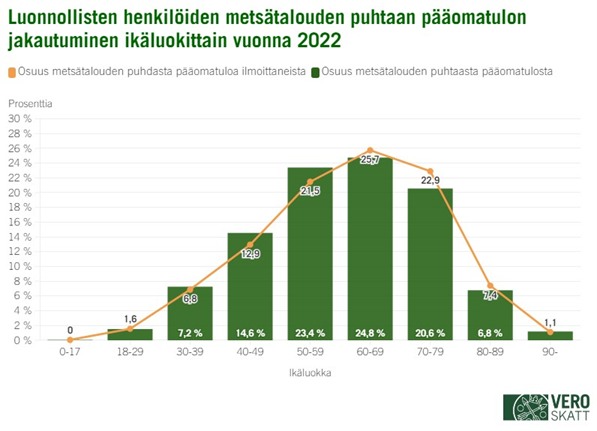 Vuonna 2022 suurimman osan (24,8 %) metsätalouden pääomatulosta saivat 60-69 vuotiaat, joita metsätalouden pääomatuloa ilmoittaneiden kokonaismäärästä oli 25,7 %. Toiseksi suuren osuuden pääomatulosta (23,4 %) saivat 50-59-vuotiaat, joita ilmoittajista oli 21,5 prosenttia.