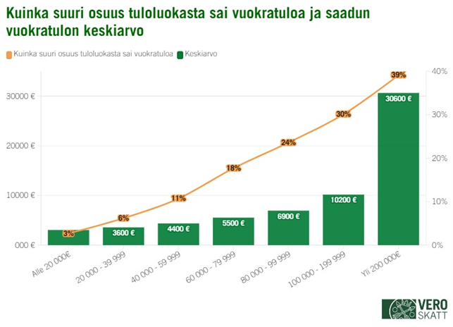 Muiden pääomatulojen tavoin tuloluokka korreloi ikäluokkaa huomattavasti enemmän vuokratulojen kanssa. Isoimmassa tuloluokassa yli 200 000 euroa 39 prosenttia sai vuokratuloa keskiarvon ollessa reilut 30 tuhatta euroa.