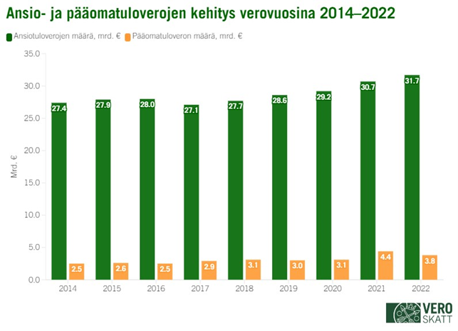 Kuva 1: Ansio- ja pääomatulojen kehitys verovuosina 2014–2022