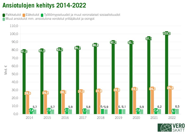 Ansiotulojen positiivista kehitystä selittää erityisesti parantunut työllisyystilanne. Vuonna 2022 palkkatulot kasvoivat edellisvuodesta 6,2 miljardia yhteensä 103,3 miljardiin (+6,4 %). Vuonna 2022 palkkatuloja saaneita oli hieman vajaa 3 miljoonaa, joka oli 87 tuhatta enemmän kuin vuonna 2021 (+3,0 %). Parantuneen työllisyystilanteen myötä myös työttömyysetuuksien määrässä tapahtui odotetut muutokset. Euromääräisesti työttömyysetuuksia saatiin vuonna 2022 vajaa 3,7 miljardia, joka oli 0,9 miljardia vähemmän (-20,6 %) kuin vuonna 2021. Työttömyysetuuksia sai vuonna 2022 yhteensä 552 tuhatta henkilöä, joka oli 124 tuhatta vähemmän (-18,4 %) kuin vuotta aiemmin.