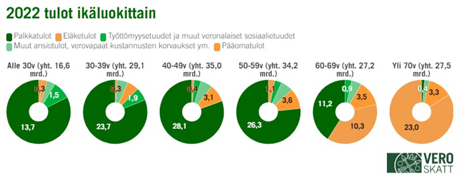 40–49-vuotiaat tienasivat ikäluokista eniten, yhteensä 35,0 miljardia, josta palkkatulojen osuus oli 28,1 miljardia. Vastaavasti 60–69-vuotiaat tienasivat ensimmäistä kertaa enemmän palkkaa kuin eläkettä, mikä kertoo yli 60-vuotiaiden työllisyyden noususta. Pääomatulojen määrä jakautui varsin tasaisesti kaikkien 40-vuotta vanhempien ikäluokkien kesken.