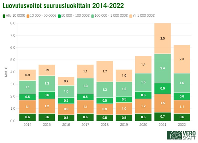 Kuva 7: Luovutusvoitot suuruusluokittain 2014–2022