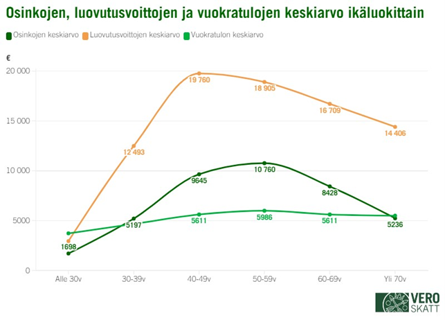 Kuva 9: Osinkojen, luovutusvoittojen ja vuokratulojen keskiarvo ikäluokittain
