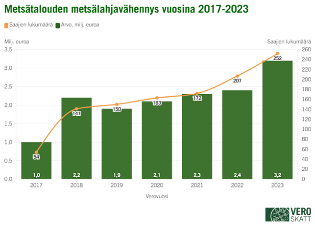 Lahjaksi saadusta metsästä tietyillä ehdoilla tehtävää metsälahjavähennystä sai vuonna 2023 252 asiakasta (+21,7 %), yhteensä 3,2 miljoonaa euroa. Tämä oli noin 780 000 euroa (+32,0 %) enemmän kuin vuotta aiemmin. Keskimääräinen metsälahjavähennys nousi vuoden 2022 11 815 eurosta 12 816 euroon, kun puolestaan mediaani laski 8 158 eurosta 7 942 euroon. Myös metsälahjavähennystä on voinut saada verovuodesta 2017 alkaen.