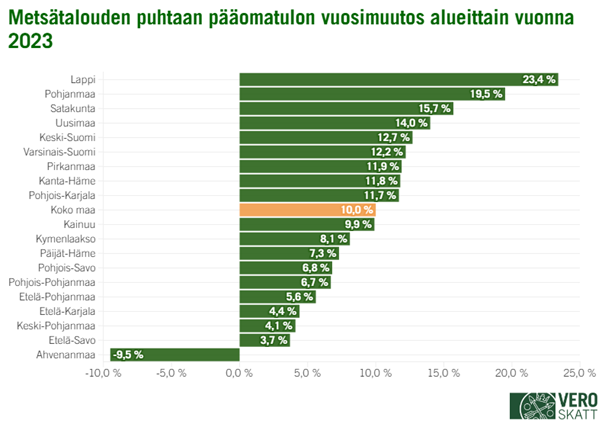Verovelvollisen kotikuntaan perustuvan alueellisen tarkastelun perusteella metsätalouden puhdas pääomatulo kasvoi vuonna 2023 eniten Lapissa (+23,4 %) ja toiseksi eniten Pohjanmaalla (+19,5 %). Metsätalouden puhtaan pääomatulon määrä laski vuoteen 2022 verrattuna ainoastaan Ahvenanmaalla (-9,5 %), jossa myös metsätalouden puhtaan pääomatulon saajien lukumäärä laski 13,1 prosentilla edellisestä vuodesta.