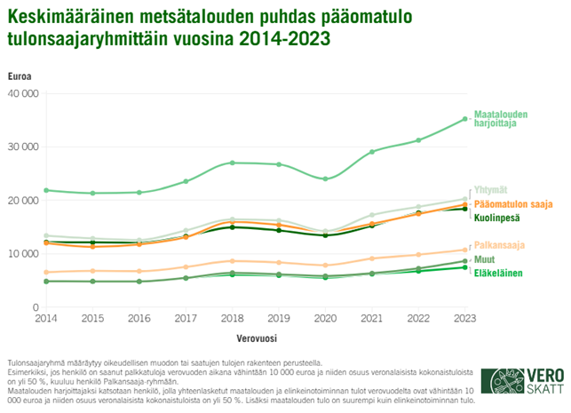 Vaikka uusimaalaiset saivat suurimman osan metsätalouden puhtaasta pääomatulosta, päijäthämäläisillä metsätulot olivat keskimääräisesti tarkasteltuna korkeimmat. Jo seitsemättä vuotta putkeen luonnollisten henkilöiden saama keskimääräinen metsätalouden puhdas pääomatulo oli suurimmillaan Päijät-Hämeessä (23 013 euroa). Toiseksi suurin se oli vuonna 2023 Kanta-Hämeessä (21 034 euroa) ja pienimmillään Ahvenanmaalla (5 950 euroa). Metsätalouden pääomatulon mediaani oli keskiarvoa merkittävästi pienempi, noin 8 400 euroa koko maan tasolla tarkasteltuna. Keskiarvon ja mediaanin laskennassa on huomioitu annettujen veroilmoitusten lukumäärä ja koska puolisot usein ilmoittavat tietonsa yhteisellä ilmoituksella, kuvaavat tunnusluvut veroilmoituksilla ilmoitettujen tietojen keskiarvoa ja mediaania.