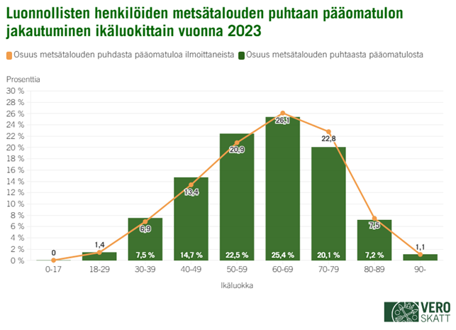 Vuonna 2023 suurimman osan (25,4 %) metsätalouden pääomatulosta saivat 60-69 vuotiaat, joita metsätalouden pääomatuloa ilmoittaneiden kokonaismäärästä oli 26,1 %. Toiseksi suuren osuuden pääomatulosta (22,5 %) saivat 50-59-vuotiaat, joita ilmoittajista oli 20,9 prosenttia.