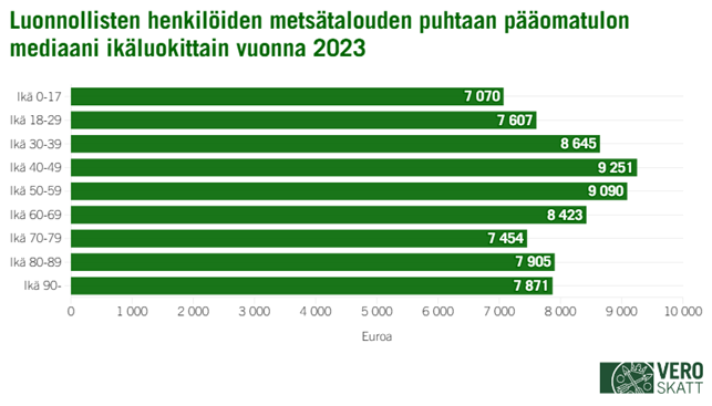 Vaikka 60-69 vuotiaat saivat suurimman osuuden metsätalouden pääomatulosta, korkein metsätalouden pääomatulojen mediaani oli 40-49-vuotiailla (9 251 euroa), toiseksi suurin 50-59-vuotiailla (9 090 euroa) ja kolmanneksi suurin 30-39-vuotiailla (8 645 euroa).