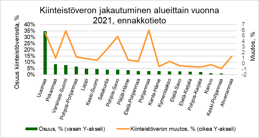 Ennakkotietojen mukaan Uudellamaalla sijaitsevien kuntien osuus laskennallisesta kiinteistöverosta on 35 %. Seuraavaksi suurin osuus on Pirkanmaan kunnilla (8,5 %) ja Varsinais-Suomen kunnilla (7,6 %).
