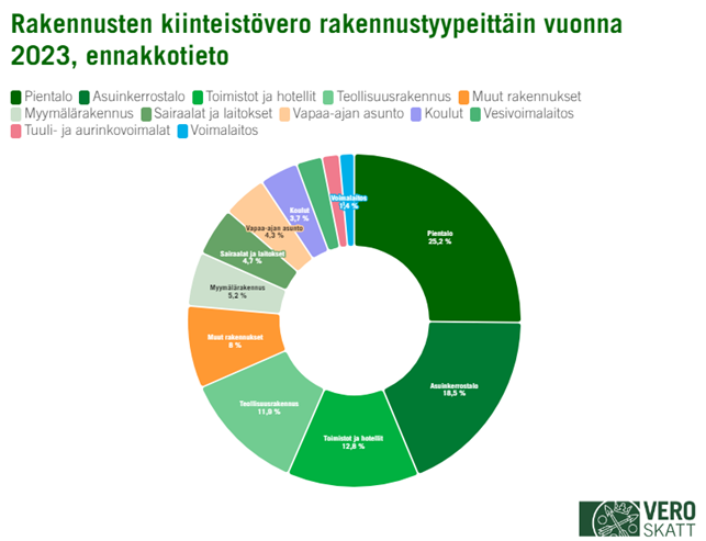 Ennakkotietojen mukaan vuonna 2023 kiinteistöveroa määrätään rakennuksista yhteensä 1 697 miljoonaa euroa. Tästä suurin osa, 427 miljoonaa euroa (25,2 % rakennusten kiinteistöverosta) kertyy pientaloista eli omakotitaloista, rivitaloista ja paritaloista. Toiseksi suurin osa, 314 miljoonaa euroa (18,5 %), kertyy asuinkerrostaloista. Edellä mainituissa luvuissa on huomioitu ainoastaan rakennuksista määrätty kiinteistövero, eli kiinteistöveroa maapohjista, joilla rakennukset sijaitsevat, ei ole huomioitu.