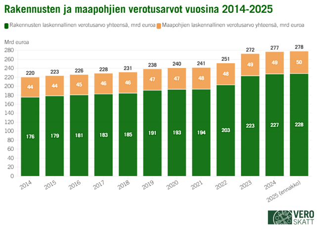 Kuva 1: Rakennusten ja maapohjien verotusarvot vuosina 2014–2025