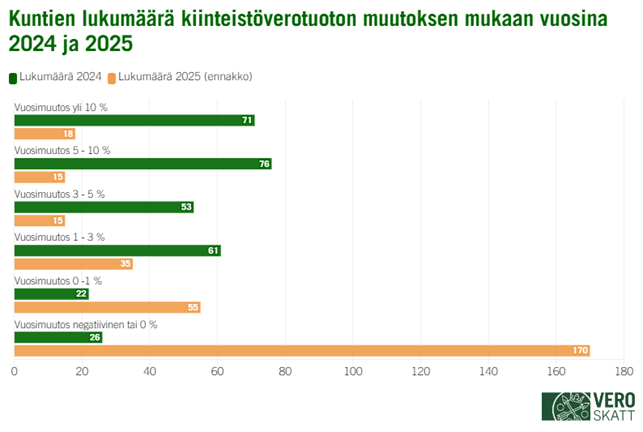 Ennakkotietojen mukaan vuoden 2025 laskennallisen kiinteistöveron tuotto kasvaa yli viisi prosenttia 33 kunnassa. Kiinteistöveron tuotto laskee tai pysyy ennallaan edellisvuoteen verrattuna 170 kunnassa. Kymmenessä kunnassa, joissa kiinteistöverotuottoa kasvaa ennakkotietojen perusteella eniten, on joko korotettu kiinteistöveroprosentteja tai rakennettu tuuli- ja aurinkovoimaloita.