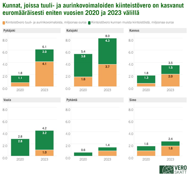 Tuuli- ja aurinkovoiman merkitys on kasvanut ja kasvaa edelleen sitä mukaa kun suunnitteilla ja rakenteilla olevat tuuli- ja aurinkovoimalat etenevät ja lopulta valmistuvat. Esimerkiksi Pyhäjoella tuuli- ja aurinkovoimaloista maksuunpantu kiinteistövero on kasvanut vuosien 2020 ja 2023 välillä vajaalla 3,5 miljoonalla eurolla, mikä on osaltaan vaikuttanut kunnan kiinteistöveron kokonaismäärän kasvuun 1,8 miljoonasta 6,1 miljoonaan. Kalajoella tuuli- ja aurinkovoimaloiden kiinteistöveron määrä on kasvanut samalla aikavälillä noin 2,1 miljoonalla eurolla. Pyhännällä tuuli- ja aurinkovoimaloista maksuunpantu kiinteistövero oli 0 euroa vuonna 2020 kun vuonna 2023 määrä oli euroissa jo 0,8 miljoonaa euroa.