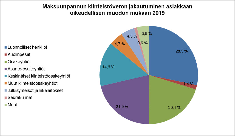 Henkilöasiakkaita (luonnolliset henkilöt ja kuolinpesät) on kaikista kiinteistöveron maksajista lukumääräisesti 93 prosenttia, mutta euromääräisesti henkilöasiakkaiden osuus kiinteistöveron kokonaismäärästä on vajaa kolmannes (30 %). Sekä osakeyhtiöillä (20 %) että asunto-osakeyhtiöillä (22 %) on kiinteistöveron kokonaismäärästä noin viidenneksen osuus, kiinteistöosakeyhtiöillä noin 15 prosentin osuus ja loput 14 prosenttia jakautuvat julkisyhteisöjen ja muiden oikeudellisten muotojen välille.