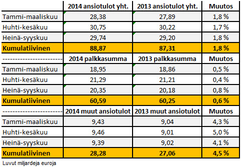 Kausiveroilmoitustietojen perusteella tammi-syyskuussa ansiotulot kasvoivat viime vuodesta 1,8 prosenttia jakaantuen palkkasumman 0,6 prosentin ja muiden ansiotulojen 4,5 prosentin kasvuun (kts. taulukko 1).