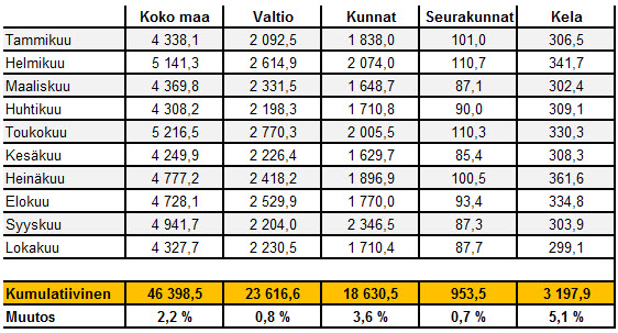 Lokakuun 2014 verojen nettokertymät olivat yhteensä 4 510 miljoonaa euroa. Kasvua vuodentakaiseen tuli 157 miljoonaa (+3,6 %).