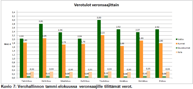 Tammi-elokuussa veronsaajille tilitettiin yhteensä 37 954 miljoonaa, josta valtion osuus oli 52 %, kuntien 39 %, seurakuntien 2 % ja Kansaneläkelaitoksen 7 %.