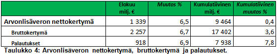 Arvonlisäveroa kertyi elokuussa yhteensä 1 339 miljoonaa, joka oli 82 miljoonaa (+6,5 %) enemmän kuin vuotta aiemmin. Sekä arvonlisäveron bruttokertymä (+6,7 %) että palautukset (+6,9 %) kasvoivat vuodentakaisesta. Tammi-elokuussa bruttokertymä (+3,6 %) ja palautusten (+7,8 %) määrä ovat niin ikään nousseet, mutta koska palautukset ovat kasvaneet selvästi enemmän, ovat ne painaneet arvonlisäveron nettokertymän lähelle nollakasvua (+0,4 %).