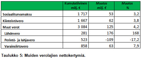 Muista tuloveron verolajeista jäännösveroja (4,0 %) ja pääasiassa tammi-helmikuussa kertyviä ennakon täydennysmaksuja (14,7 %) maksettiin enemmän. Tuloveron nettokertymää laski asiakkaille palautettavien ennakonpalautusten (+2,2 %) määrän nousu ja ennakkoveroja (-6,6 %) kertyi edellisvuotta vähemmän. Ennakonpidätyksissä ja ennakkoveroissa oli pääosin kyse verovuoden 2016 veroista, kun taas ennakon täydennysmaksut viittaavat erityisesti verovuoden 2015 pääomatuloihin. Verovuoden 2016 pääomatuloverojen osalta tiedetään enemmän vasta myöhemmin kuluvan kevään aikana ennakon täydennysmaksujen sekä vuosi-ilmoitusten antamisen myötä. Vuonna 2016 palautetut ennakonpalautukset liittyvät pääosin verovuoden 2015 verotukseen, kun taas 2016 maksetuissa jäännösveroissa oli suurimmaksi osaksi kyse verovuoden 2014 jäännösveron 2. erän ja verovuoden 2015 jäännösveron 1. erän maksuista.