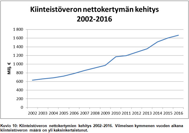 Kunnille tilitettävää kiinteistöveroa kertyi lähes 1,7 miljardia, jossa oli nousua edellisvuodesta 62 miljoonaa (+3,8 %). Kiinteistöverotuksessa käytettävät verotusarvot kasvoivat vuotta aiemmasta rakennusten osalta 1,1 prosenttia ja maapohjan osalta 1,4 prosentin. Lisäksi kiinteistöveroprosentit nousivat monessa kunnassa. Kaikkiaan kiinteistöveroa määrättiin vuonna 2016 reilulle kahdelle miljoonalle asiakkaalle (+0,3 %) yhteensä 1 675 miljoonaa. Kiinteistöveron määrä on viime vuosien aikana kasvanut varsin nopeasti, sillä vuonna 2010 kiinteistöveroa määrättiin 1 184 miljoonaa euroa ja vuonna 2013 vielä 1 366 miljoonaa. Kiinteistöjen lukumäärä ei ole kasvanut samassa suhteessa ja selittävä tekijä onkin juuri kiinteistöveron perusteiden kiristyminen.